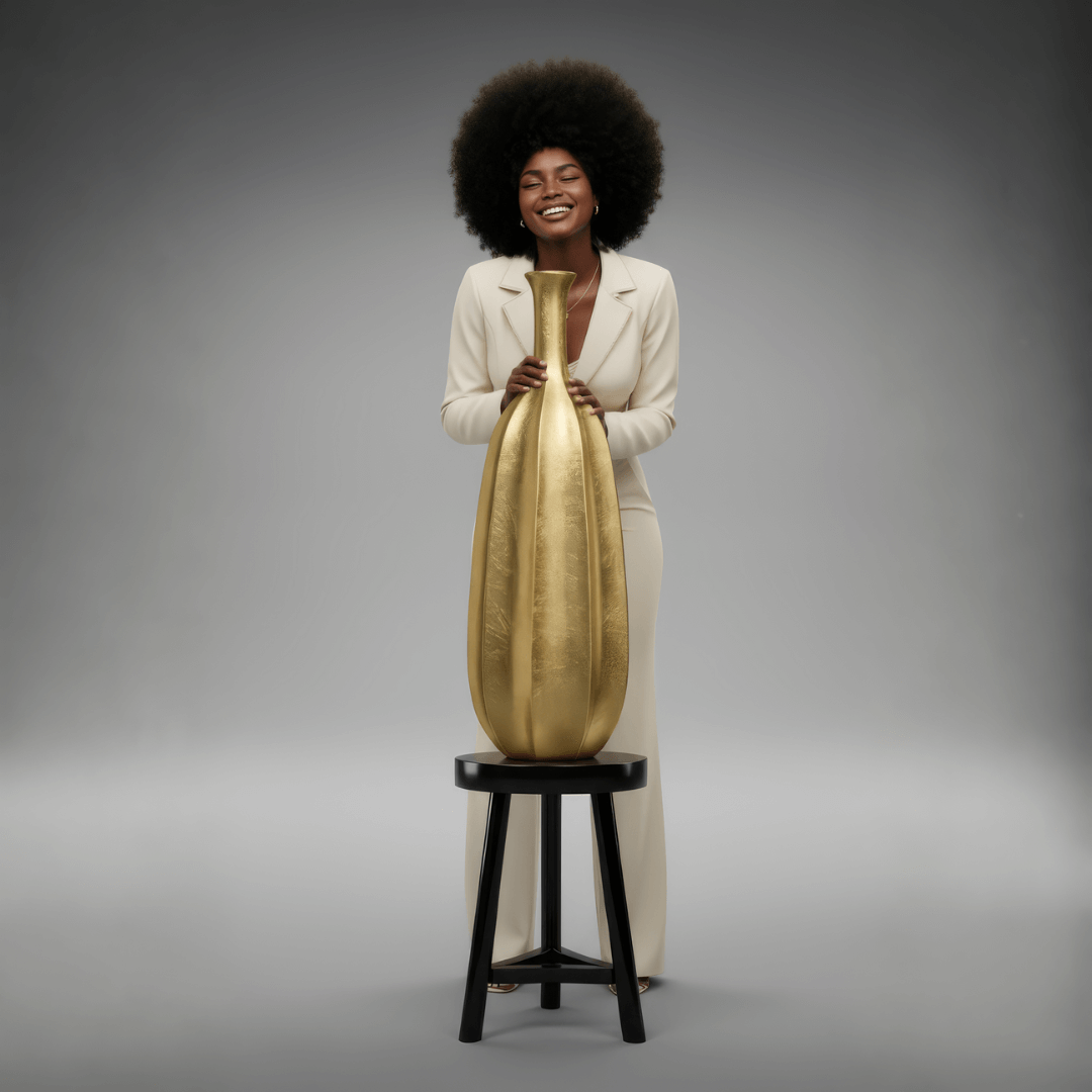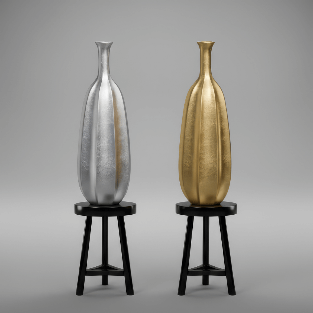 The STAR Vase draws the eye with bold angles and a modern edge. Its faceted form reflects light beautifully, while the hand-applied metallic finish adds depth and shine. Made from durable fiberglass, it offers a sculptural look with a lightweight feel — crafted for spaces that value form, texture, and presence.